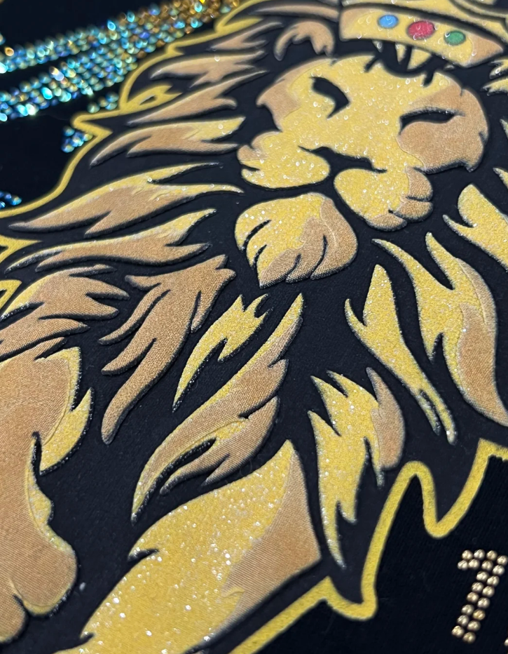 The 3D flocked European crystal hot stamping process combines the three-dimensional touch of flocking with the sparkle of European crystals, formed by high-temperature hot stamping, suitable for high-end apparel decoration.